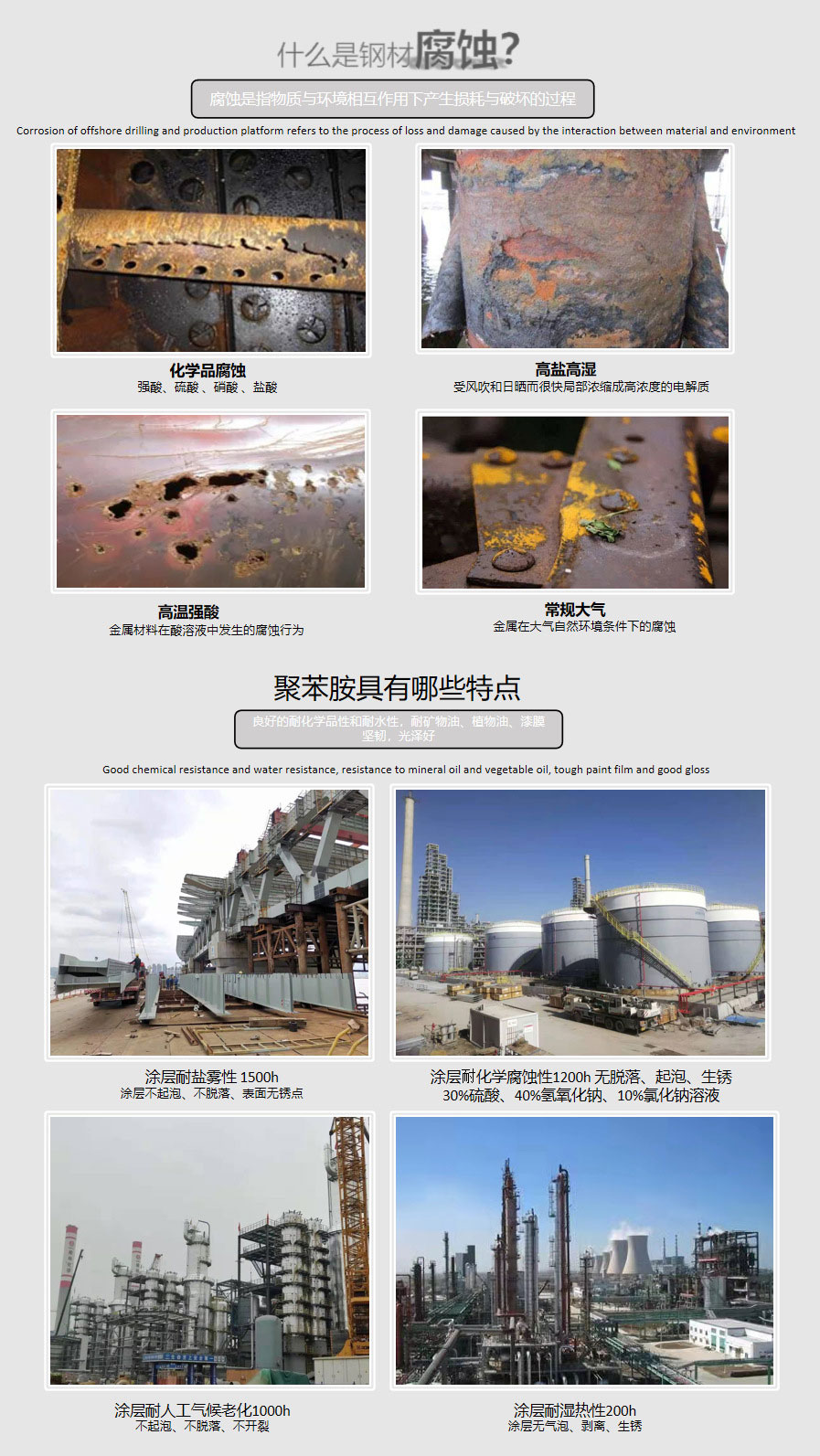 無溶劑環(huán)氧/聚氨酯體系,致密涂膜,耐酸、堿、鹽、油等化學介質。